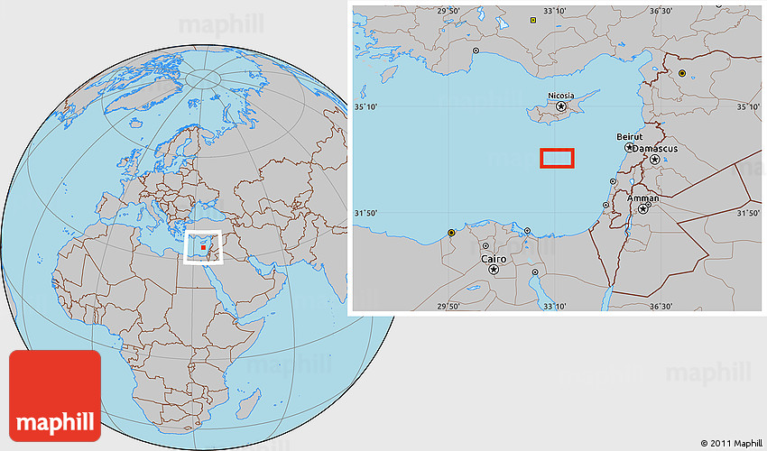 Maphill is a collection of map images. This image combines a gray map with the globe centered on the area around 33° 32' 52" N, 33° 13' 30" E. Use the buttons under the image to switch to different map types.