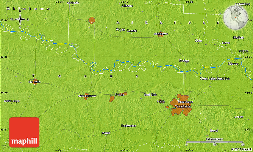 Maphill is a collection of map images. This physical map of the area around 33° 32' 52" N, 94° 16' 30" W is one of them. Click on the Detailed button under the image to switch to a more detailed map.