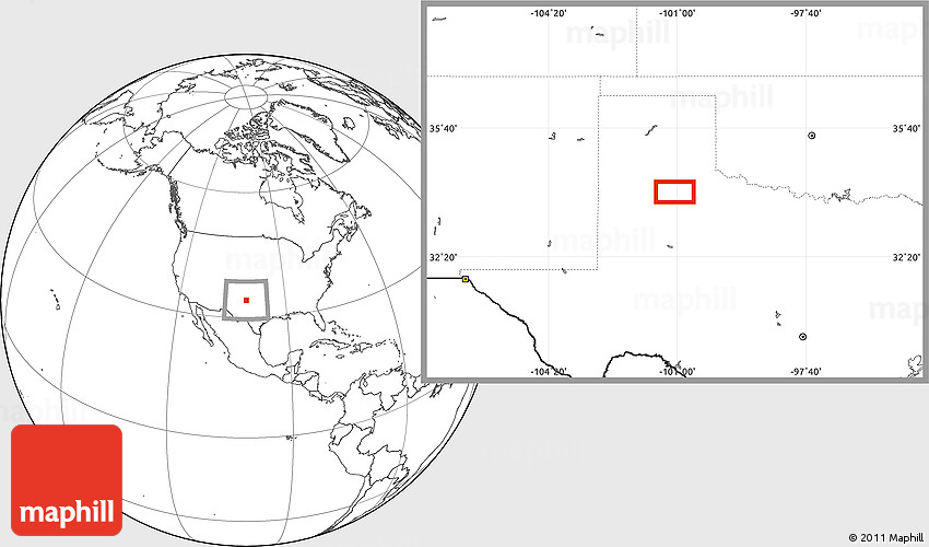 Maphill is a collection of map images. This image combines a blank map with the globe centered on the area around 34° 0' 57" N, 101° 4' 29" W. Use the buttons under the image to switch to different map types.