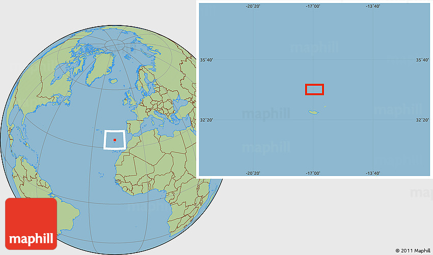 The location map of the area around 34° 0' 57" N, 16° 55' 29" W combines two projections: the orthographic azimuthal projection for the globe and the simple geographic projection for the rectangular part of the map. Geographic projection has straight meridians and parallels, each degree of latitude and longitude is the same size over the entire world map.