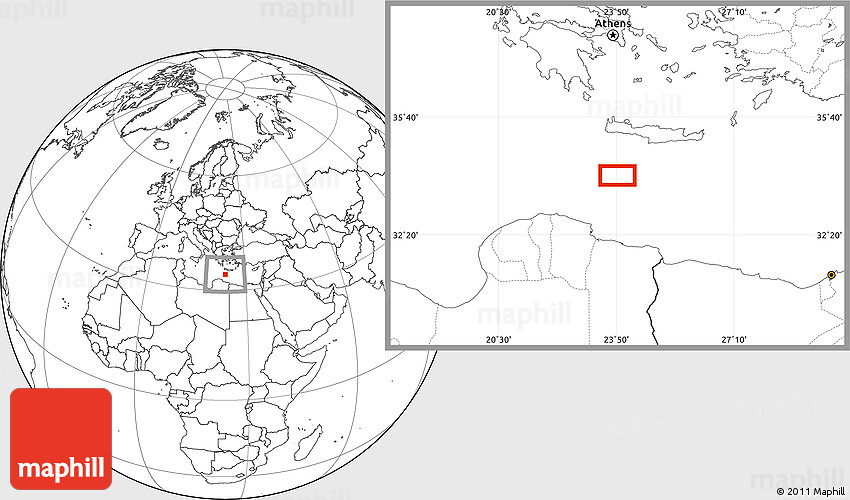 Maphill is a collection of map images. This image combines a blank map with the globe centered on the area around 34° 0' 57" N, 23° 52' 30" E. Use the buttons under the image to switch to different map types.