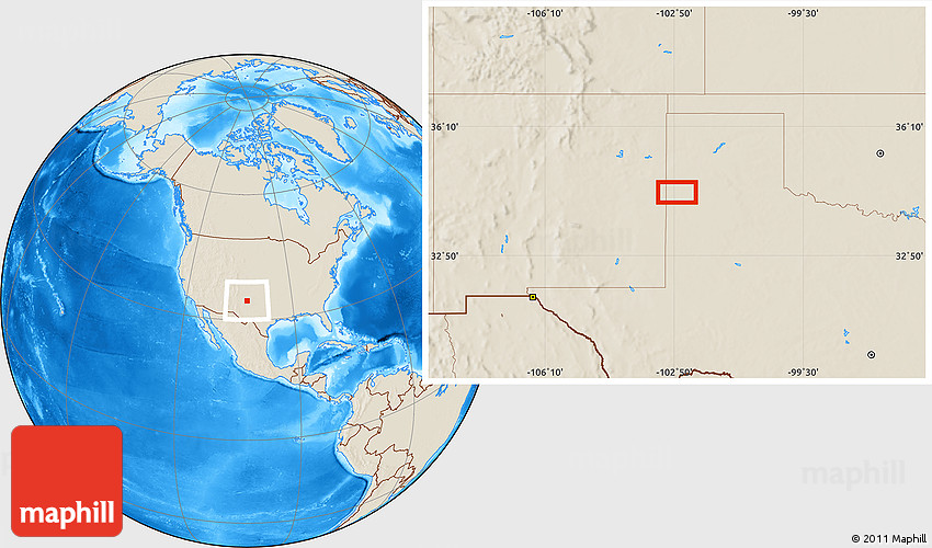 Maphill is a collection of map images. This image combines a shaded relief map with the globe centered on the area around 34° 28' 56" N, 102° 46' 30" W. Use the buttons under the image to switch to different map types.