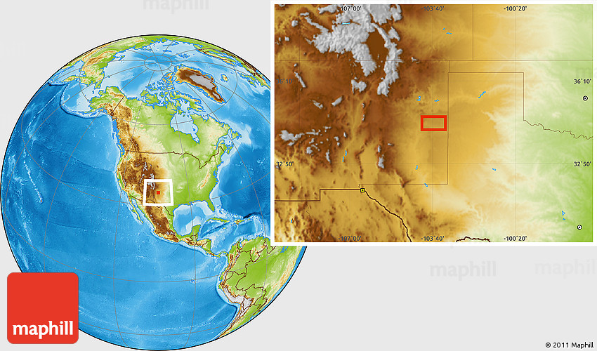 Maphill is a collection of map images. This image combines a physical map with the globe centered on the area around 34° 28' 56" N, 103° 37' 30" W. Use the buttons under the image to switch to different map types.