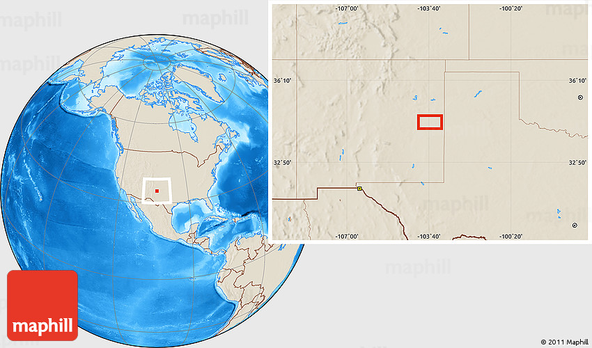 Maphill is a collection of map images. This image combines a shaded relief map with the globe centered on the area around 34° 28' 56" N, 103° 37' 30" W. Use the buttons under the image to switch to different map types.