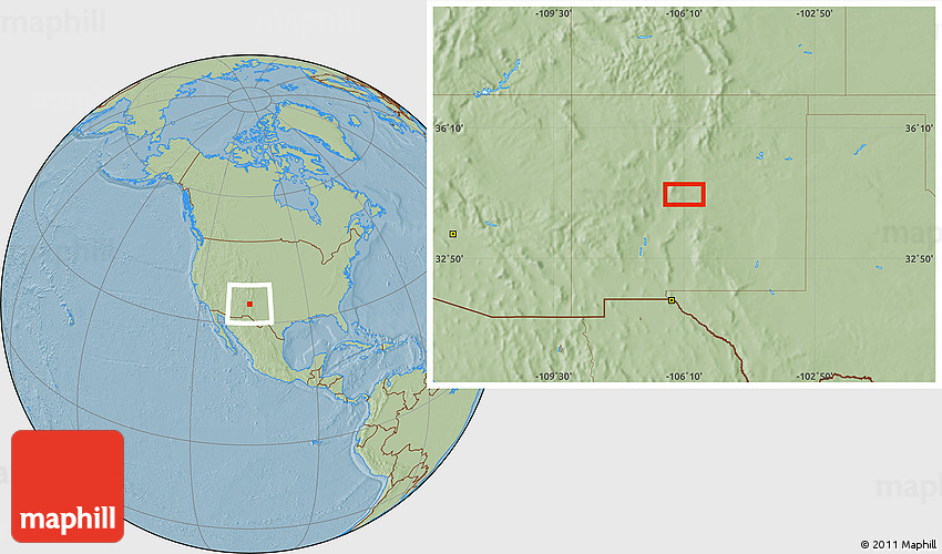 The location map of the area around 34° 28' 56" N, 106° 10' 30" W combines two projections: the orthographic azimuthal projection for the globe and the simple geographic projection for the rectangular part of the map. Geographic projection has straight meridians and parallels, each degree of latitude and longitude is the same size over the entire world map.