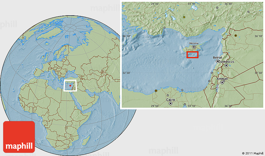 Maphill is a collection of map images. This image combines a savanna style map with the globe centered on the area around 34° 28' 56" N, 33° 13' 30" E. Use the buttons under the image to switch to different map types.