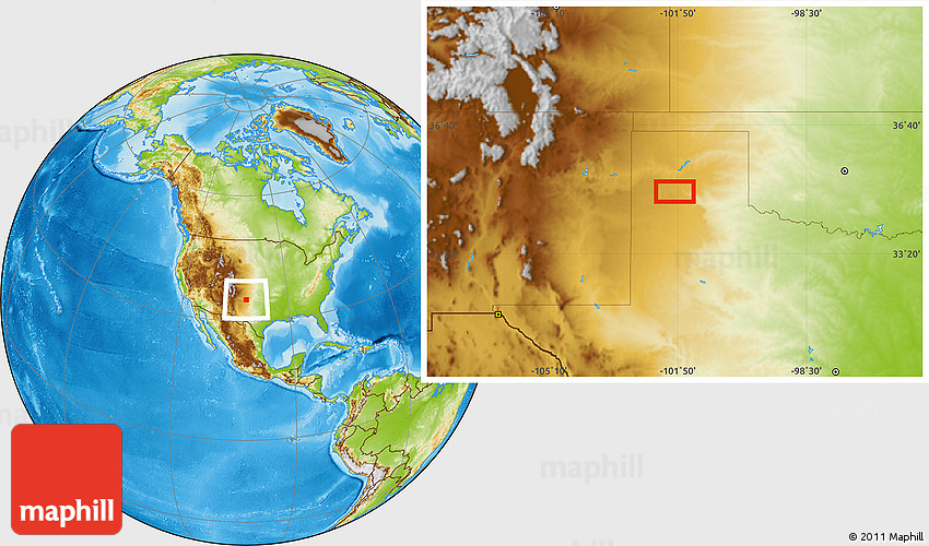 Maphill is a collection of map images. This image combines a physical map with the globe centered on the area around 34° 56' 49" N, 101° 55' 30" W. Use the buttons under the image to switch to different map types.