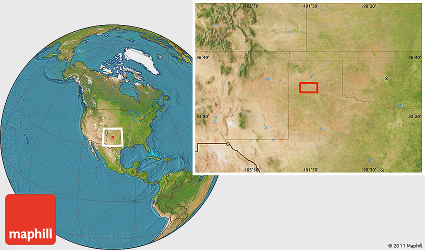 Maphill is a collection of map images. This image combines a satellite map with the globe centered on the area around 34° 56' 49" N, 101° 55' 30" W. Use the buttons under the image to switch to different map types.