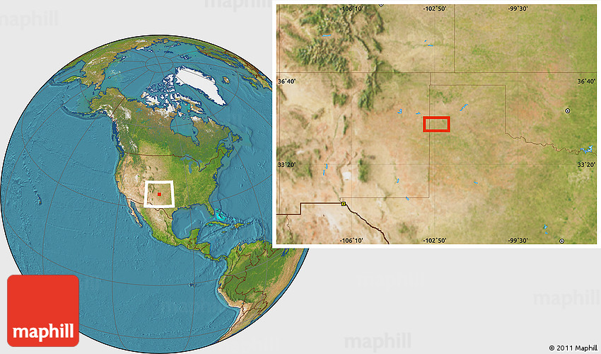 Maphill is a collection of map images. This image combines a satellite map with the globe centered on the area around 34° 56' 49" N, 102° 46' 30" W. Use the buttons under the image to switch to different map types.