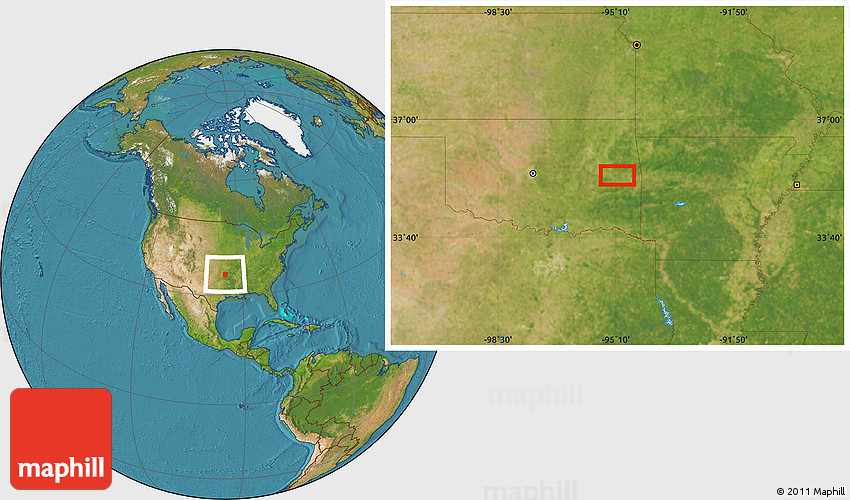 Maphill is a collection of map images. This image combines a satellite map with the globe centered on the area around 35° 24' 37" N, 95° 7' 30" W. Use the buttons under the image to switch to different map types.