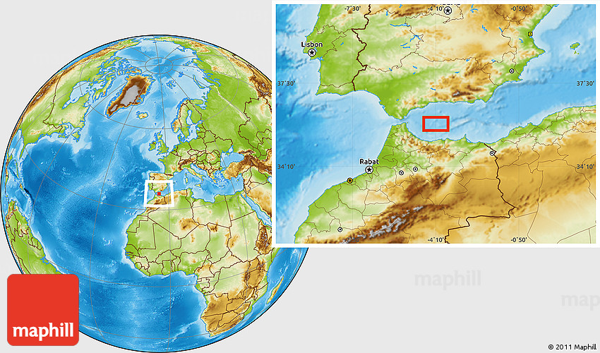 Maphill is a collection of map images. This image combines a physical map with the globe centered on the area around 35° 52' 19" N, 4° 10' 30" W. Use the buttons under the image to switch to different map types.