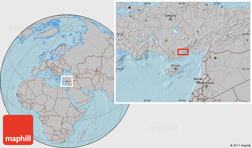 Maphill is a collection of map images. This image combines a gray map with the globe centered on the area around 36° 47' 25" N, 34° 4' 30" E. Use the buttons under the image to switch to different map types.