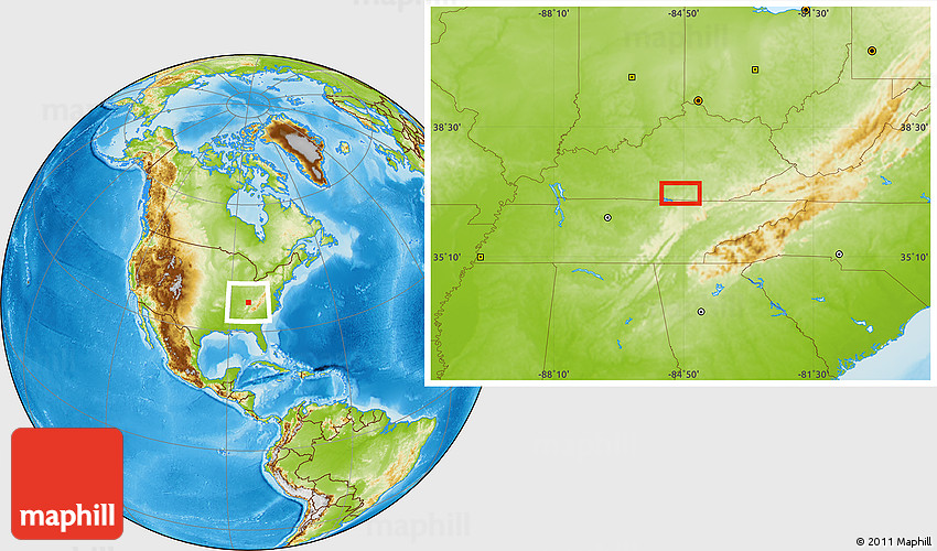 Maphill is a collection of map images. This image combines a physical map with the globe centered on the area around 36° 47' 25" N, 84° 55' 30" W. Use the buttons under the image to switch to different map types.