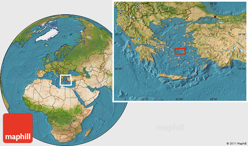 Maphill is a collection of map images. This image combines a satellite map with the globe centered on the area around 37° 42' 7" N, 25° 34' 30" E. Use the buttons under the image to switch to different map types.