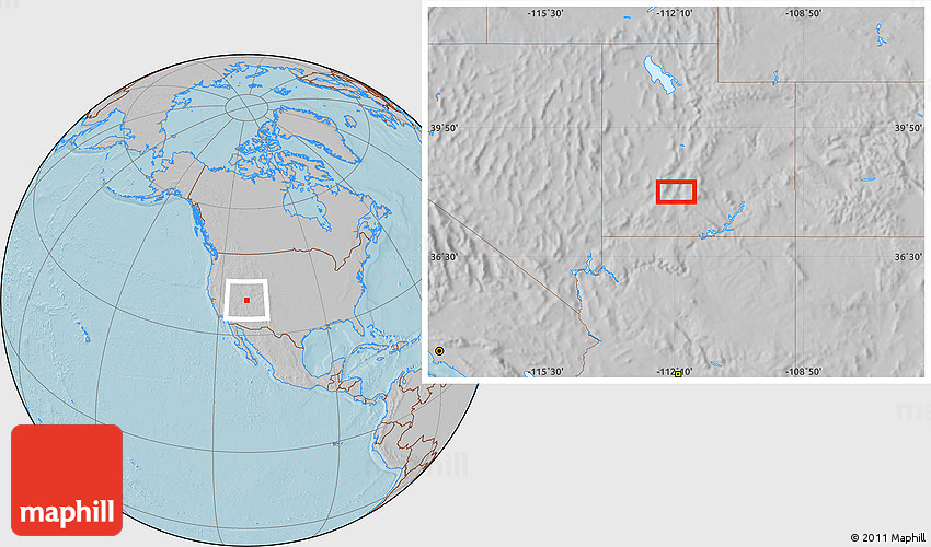 Maphill is a collection of map images. This image combines a gray map with the globe centered on the area around 38° 9' 19" N, 112° 7' 30" W. Use the buttons under the image to switch to different map types.