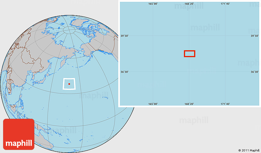 The location map of the area around 38° 9' 19" N, 168° 22' 30" E combines two projections: the orthographic azimuthal projection for the globe and the simple geographic projection for the rectangular part of the map. Geographic projection has straight meridians and parallels, each degree of latitude and longitude is the same size over the entire world map.