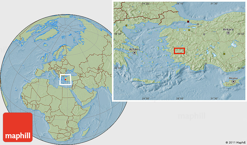 Maphill is a collection of map images. This image combines a savanna style map with the globe centered on the area around 38° 9' 19" N, 28° 7' 30" E. Use the buttons under the image to switch to different map types.