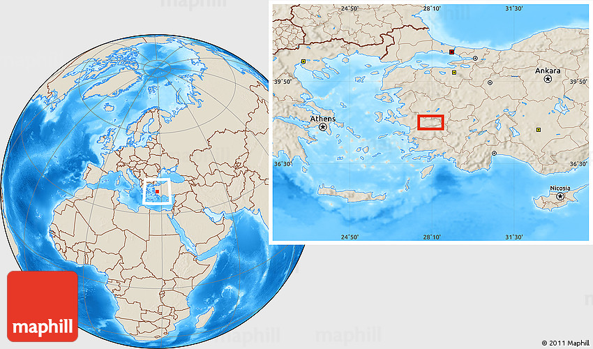Maphill is a collection of map images. This image combines a shaded relief map with the globe centered on the area around 38° 9' 19" N, 28° 7' 30" E. Use the buttons under the image to switch to different map types.
