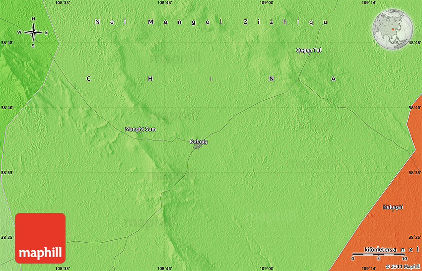 The flat political map represents one of several map types and styles available. Look at the area around 38° 36' 25" N, 108° 52' 30" E from different perspectives.