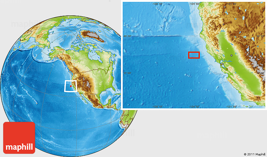 Maphill is a collection of map images. This image combines a physical map with the globe centered on the area around 38° 36' 25" N, 124° 52' 30" W. Use the buttons under the image to switch to different map types.