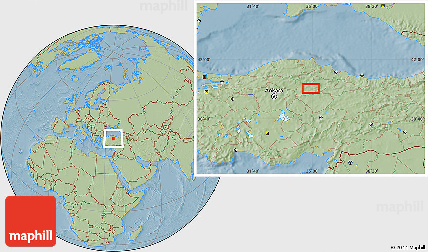 The location map of the area around 40° 23' 48" N, 34° 55' 29" E combines two projections: the orthographic azimuthal projection for the globe and the simple geographic projection for the rectangular part of the map. Geographic projection has straight meridians and parallels, each degree of latitude and longitude is the same size over the entire world map.