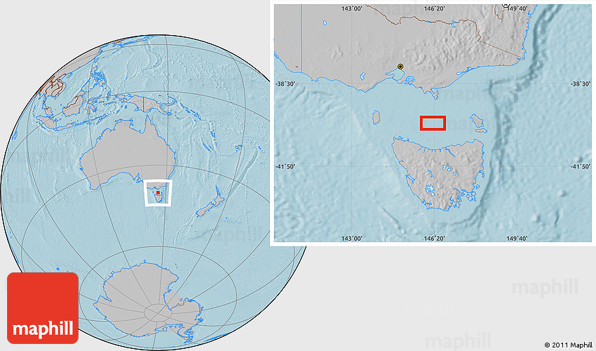 Maphill is a collection of map images. This image combines a gray map with the globe centered on the area around 40° 6' 0" S, 146° 16' 30" E. Use the buttons under the image to switch to different map types.