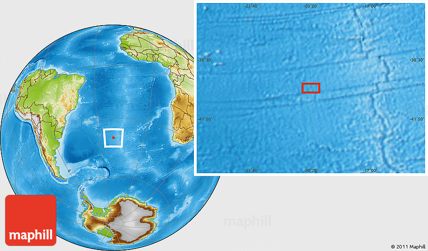 Maphill is a collection of map images. This image combines a physical map with the globe centered on the area around 40° 6' 0" S, 20° 19' 30" W. Use the buttons under the image to switch to different map types.
