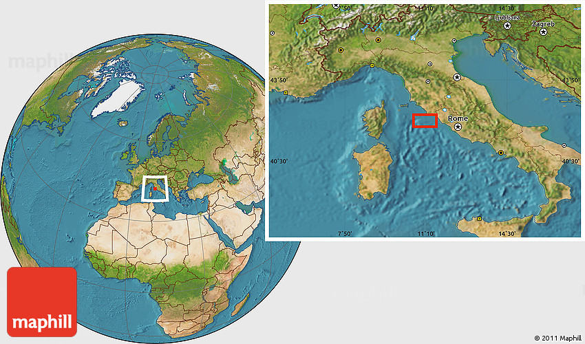 Maphill is a collection of map images. This image combines a satellite map with the globe centered on the area around 42° 9' 30" N, 11° 7' 30" E. Use the buttons under the image to switch to different map types.