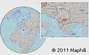 Maphill is a collection of map images. This image combines a gray map with the globe centered on the area around 42° 9' 30" N, 21° 19' 30" E. Use the buttons under the image to switch to different map types.