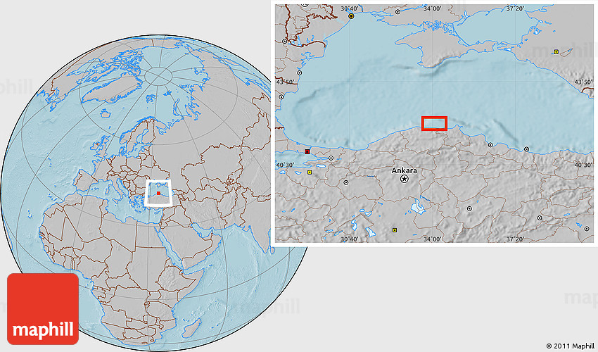 Maphill is a collection of map images. This image combines a gray map with the globe centered on the area around 42° 9' 30" N, 34° 4' 30" E. Use the buttons under the image to switch to different map types.
