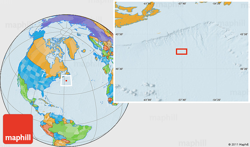 Maphill is a collection of map images. This image combines a political map with the globe centered on the area around 42° 9' 30" N, 57° 43' 30" W. Use the buttons under the image to switch to different map types.