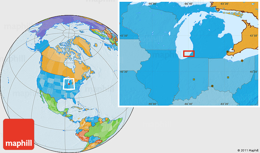 Maphill is a collection of map images. This image combines a political map with the globe centered on the area around 42° 9' 30" N, 86° 37' 30" W. Use the buttons under the image to switch to different map types.