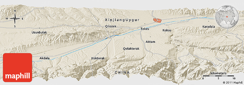Shaded relief map shows landscape features, such as mountains, valleys and plateaus. Flat areas are smooth on the map, areas with steep slopes and mountains appear more rough. The above map of the area around 43° 1' 43" N, 81° 40' 30" E was created using a digital elevation model.