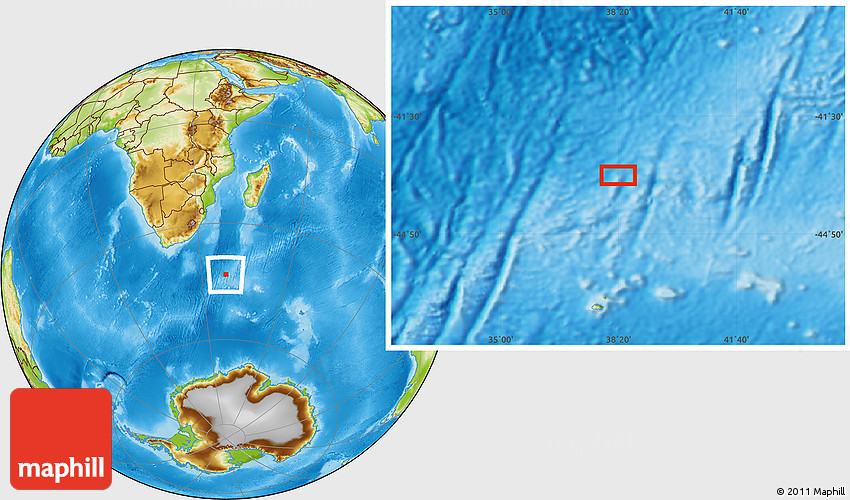 Maphill is a collection of map images. This image combines a physical map with the globe centered on the area around 43° 10' 22" S, 38° 19' 30" E. Use the buttons under the image to switch to different map types.