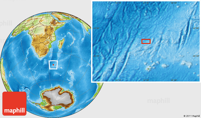 Maphill is a collection of map images. This image combines a physical map with the globe centered on the area around 43° 36' 16" S, 37° 28' 30" E. Use the buttons under the image to switch to different map types.
