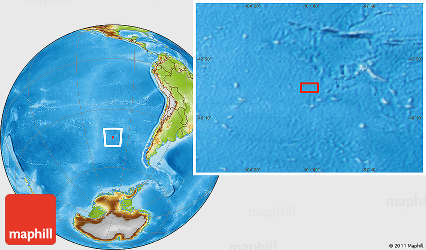 Maphill is a collection of map images. This image combines a physical map with the globe centered on the area around 44° 27' 46" S, 101° 4' 29" W. Use the buttons under the image to switch to different map types.