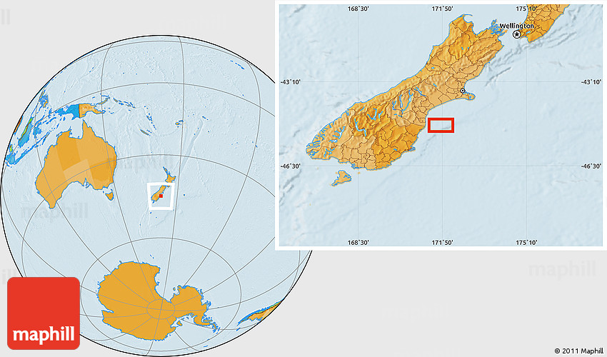 Maphill is a collection of map images. This image combines a political map with the globe centered on the area around 44° 53' 21" S, 171° 46' 30" E. Use the buttons under the image to switch to different map types.