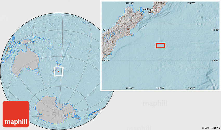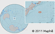 Maphill is a collection of map images. This image combines a gray map with the globe centered on the area around 44° 53' 21" S, 176° 1' 30" E. Use the buttons under the image to switch to different map types.