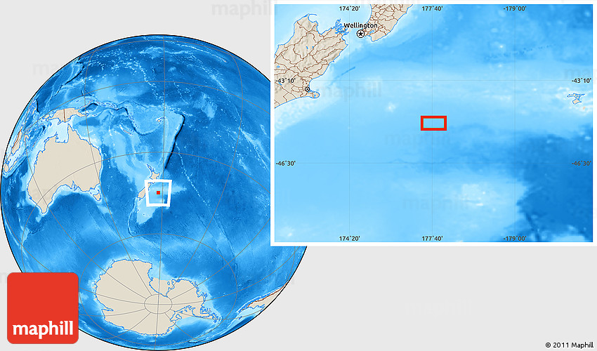 Maphill is a collection of map images. This image combines a shaded relief map with the globe centered on the area around 44° 53' 21" S, 177° 43' 29" E. Use the buttons under the image to switch to different map types.