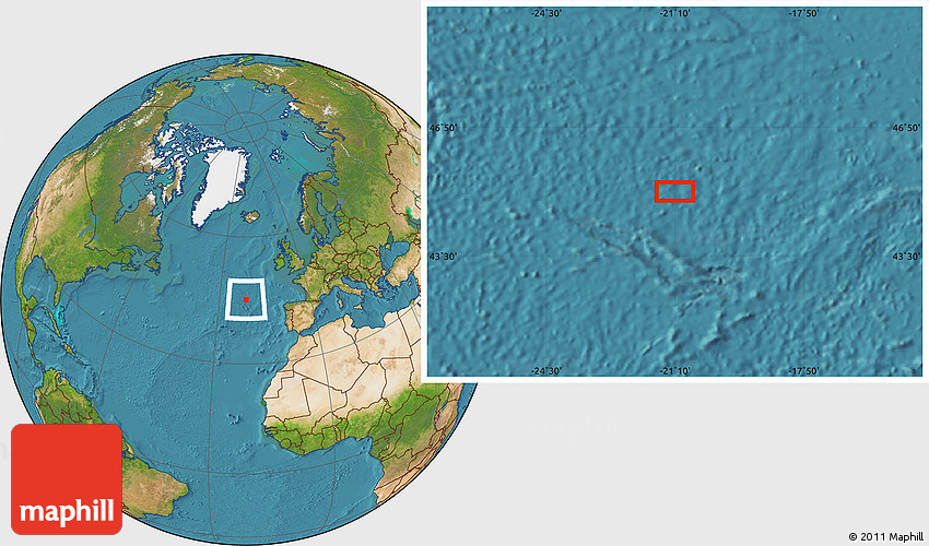 Maphill is a collection of map images. This image combines a satellite map with the globe centered on the area around 45° 10' 22" N, 21° 10' 29" W. Use the buttons under the image to switch to different map types.