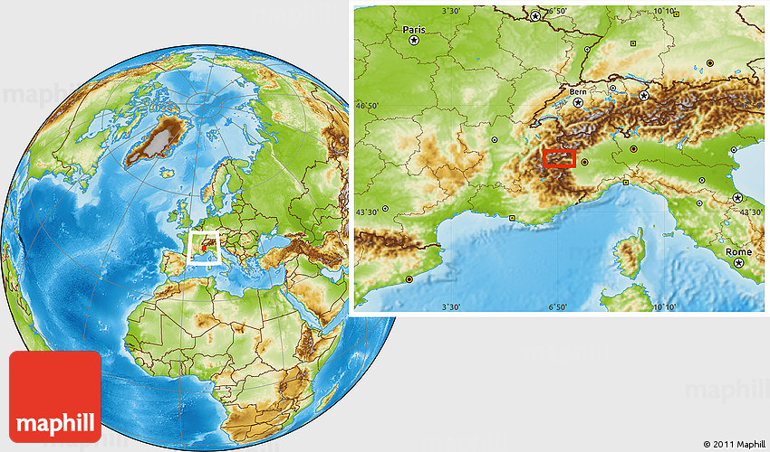 Maphill is a collection of map images. This image combines a physical map with the globe centered on the area around 45° 10' 22" N, 6° 52' 30" E. Use the buttons under the image to switch to different map types.