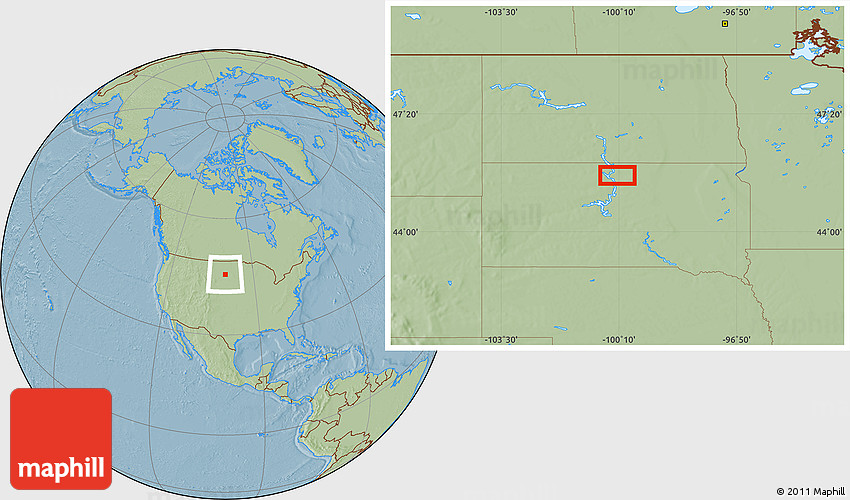 Maphill is a collection of map images. This image combines a savanna style map with the globe centered on the area around 45° 35' 46" N, 100° 13' 29" W. Use the buttons under the image to switch to different map types.