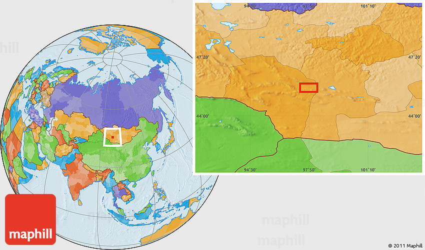 Maphill is a collection of map images. This image combines a political map with the globe centered on the area around 45° 35' 46" N, 97° 49' 29" E. Use the buttons under the image to switch to different map types.