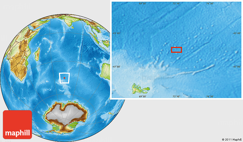 Maphill is a collection of map images. This image combines a physical map with the globe centered on the area around 45° 18' 49" S, 73° 10' 30" E. Use the buttons under the image to switch to different map types.