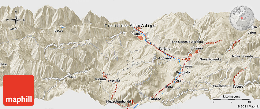 Sure, this shaded relief panoramic map is nice. But there is good chance you will like other world atlas map types even more. Select another style in the above table. Look at the region around 46° 26' 14" N, 11° 7' 30" E from a different view.