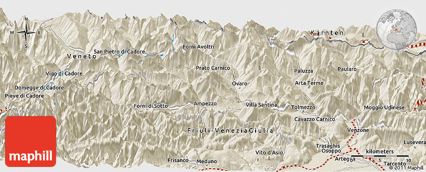 Maphill is a collection of map images. This perspective view of the area around 46° 26' 14" N, 12° 49' 29" E at an angle of 30° is one of these images. Use the Detailed button under the image to switch to a detailed map.