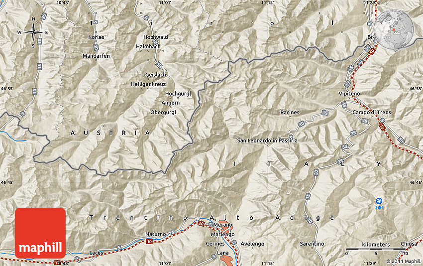 Maphill is a collection of map images. This shaded relief map of the area around 46° 51' 18" N, 11° 7' 30" E is one of them. Click on the Detailed button under the image to switch to a more detailed map.