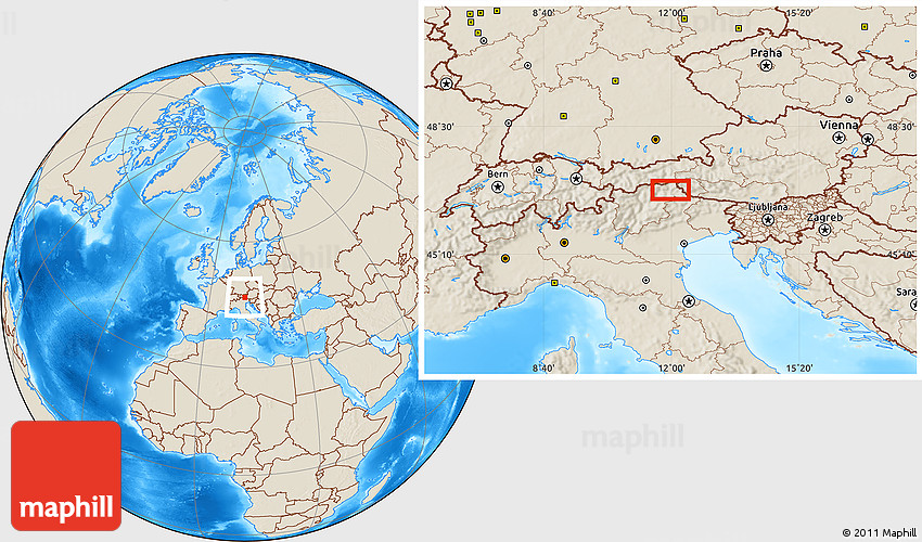 Maphill is a collection of map images. This image combines a shaded relief map with the globe centered on the area around 46° 51' 18" N, 11° 58' 29" E. Use the buttons under the image to switch to different map types.