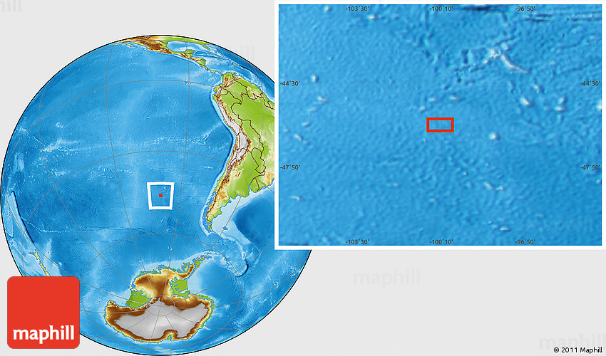 Maphill is a collection of map images. This image combines a physical map with the globe centered on the area around 46° 9' 26" S, 100° 13' 29" W. Use the buttons under the image to switch to different map types.