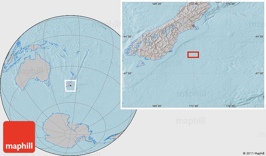 Maphill is a collection of map images. This image combines a gray map with the globe centered on the area around 46° 9' 26" S, 172° 37' 30" E. Use the buttons under the image to switch to different map types.